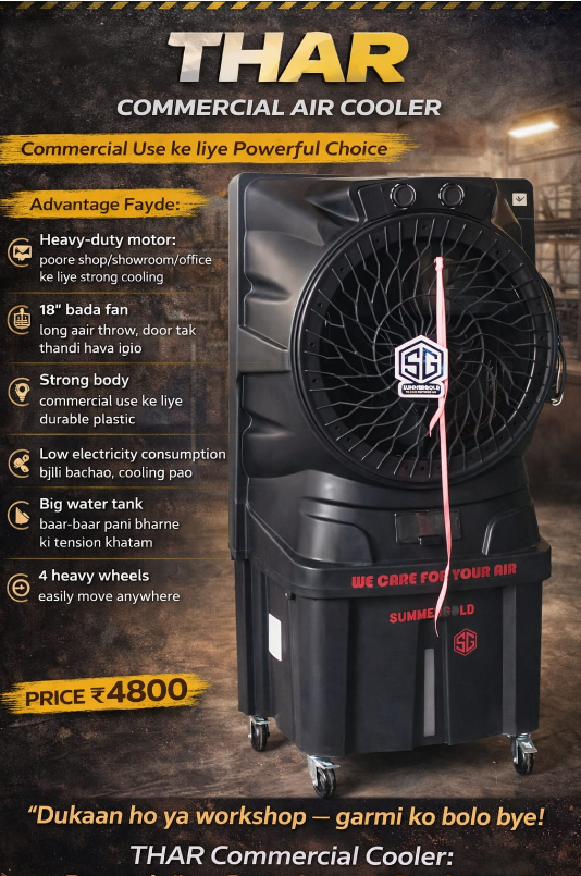 At ₹4800, the THAR Commercial Cooler offers powerful airflow, durability, and value — making it the perfect cooling solution for shops, workshops, and growing businesses.