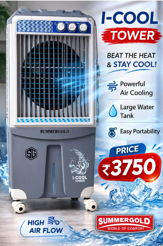 SUMMERGOLD I-COOL Tower Cooler un customers ke liye perfect hai jo strong airflow + modern design dono chahte hain.