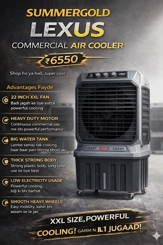 The SUMMERGOLD LEXUS Commercial Air Cooler is a premium high-capacity cooling solution designed for large commercial spaces like halls, showrooms, workshops, and factories.