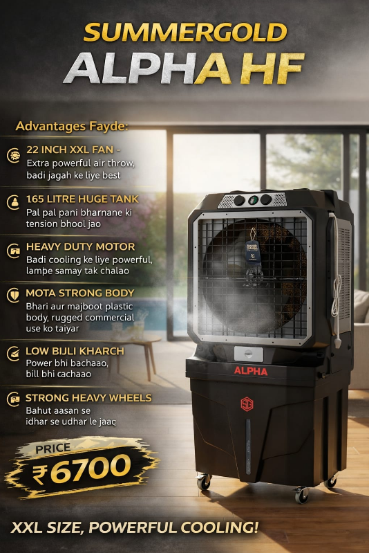 The SUMMERGOLD ALPHA HF Commercial Air Cooler is built for extreme heat and large commercial spaces where maximum airflow and long operating hours are required.