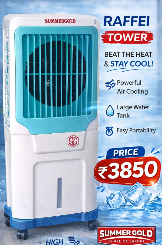 SUMMERGOLD RAFFEI Tower Cooler specially design kiya gaya hai un customers ke liye jo premium look + strong cooling performance dono chahte hain.
